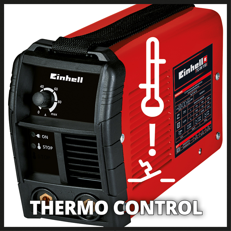Einhell TC-IW 110 inverter aparat ima mogućnost podešavanja struje zavarivanja od 10 do 100 ampera. S beskonačno podesivom kontrolom struje zavarivanja, struja se može optimalno prilagoditi radnom zadatku. Aparat za zavarivanje idealan je za hobi aplikacije, na primjer za popravke. Zavarivač se pokreće uz mrežni priključak 230 / 240V sa osiguračem od 16 ampera. Einhell aparat za zavarivanje ima ugrađeno ventilatorsko hlađenje i toplinski alarm s praktičnim svjetlosnim indikatorom. Čvrsto kućište od čeličnog lima opremljeno je remenom za nošenje. Moderna inverterska tehnologija omogućuje nisku masu samog aparata za zavarivanje.