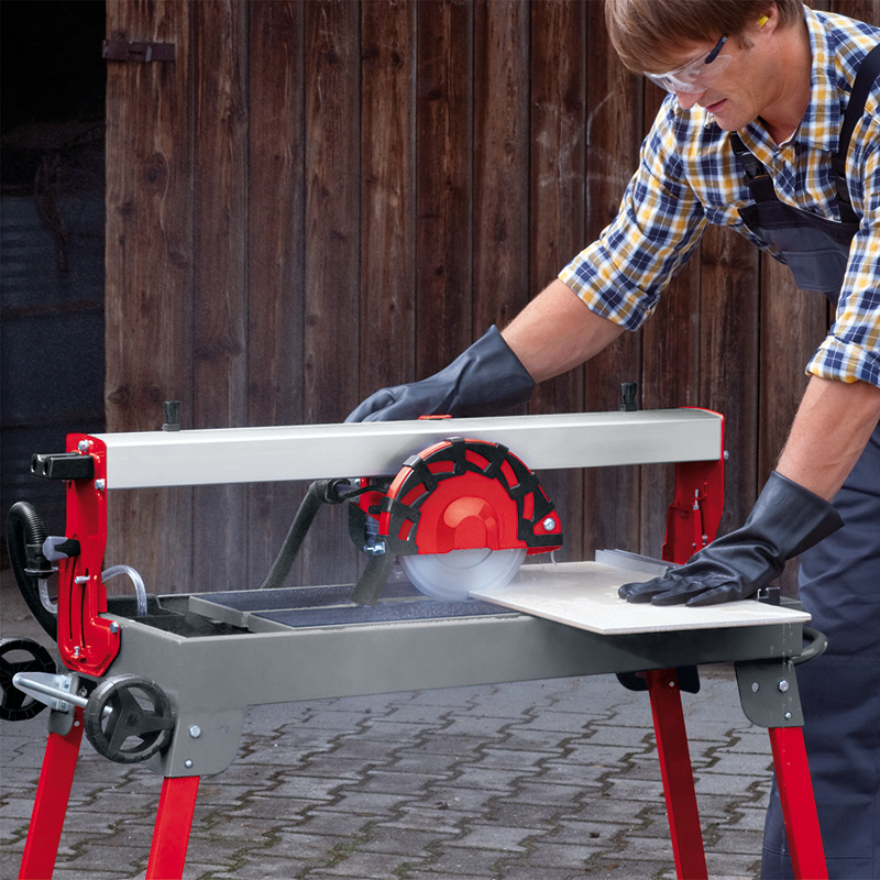 TE-TC 620 U radijalni stroj za rezanje pločica pouzdan je, kvalitetan i moćan stroj za rezanje zidnih i podnih pločica brzo i točno prema željenoj veličini. Motor od 900 W ima veliku snagu za pokretanje turbo dijamantne ploče promjera 200 mm koji s lakoćom reže čak i kroz tvrđi materijal. Izuzetno velika duljina stola od 620 mm omogućava jednostavno rezanje čak i velikih pločica. Radi preciznog i brzog rezanja TE-TC 620 U dolazi s motornom glavom koja se može beskonačno zakretati od 0 ° do 45 ° te ima motorni vodič sa kugličnim ležajem. Kosi rezovi, dvostruko kosi rezovi i uzdužni rezovi mogu se izvesti u samo nekoliko poteza zahvaljujući aluminijumskom kutnom mjerači koji se može točno prilagoditi na željeni stupanj. Crpka rashladne tekućine osigurava ne samo optimalno hlađenje dijamantne ploče, već i rad bez prašine. Uređaj ima magnet koji filtrira sitne metalne čestice iz vode da bi se zaštitila pumpa. U spremniku za skupljanje vode izrađenom od lima nalazi se i dio za prljavštinu s filtririma za pranje koji uklanjanjaju grube čestice. Veliki radni stol s neklizajućom gumenom površinom stoji na čvrstom, sklopivom osnovnom okviru s podesivim nogama i omogućuje ergonomski siguran rad. Pomicanje stroja nije problem zahvaljujući transportnim kotačima i transportnoj ručici.
